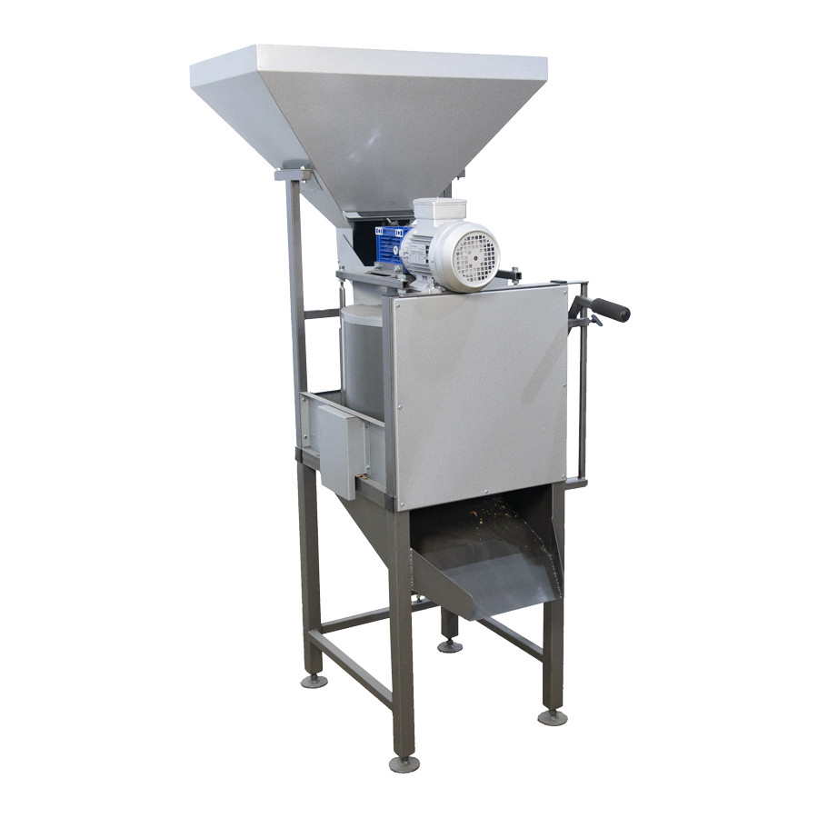 Принцип роботи: засипаємо горіх в бункер і включаємо, горіх подається з бункера за допомогою віброподачі в барабан, що обертається, де відбувається розкол. Колотий горіх відправляється у вивантажувальну ємність, а далі на сортування – вібросито та аспірацію.